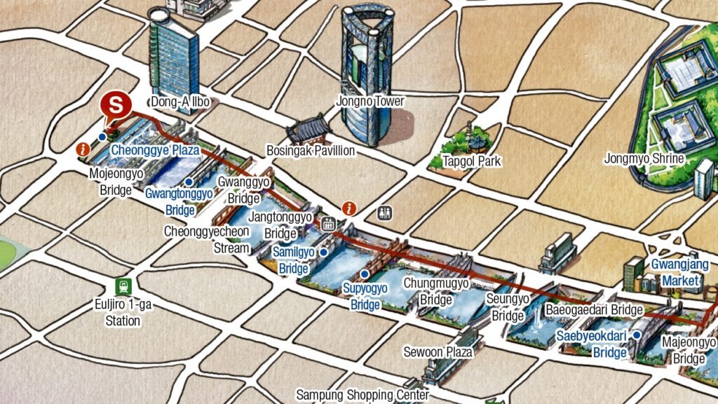 Fueron construidas redes de vías peatonales para conectar ambas orillas del río con las instalaciones culturales cercanas. Los puentes históricos Gwanggyo y Supyogyo fueron restaurados y las actividades culturales tradicionales, como el Festival de los Faroles se han revitalizado. El proyecto comenzó en julio de 2003 y se terminó en octubre de 2005 con un costo de USD 367 millones. Hoy en día se estima que reporta beneficios sociales por valor de USD 3,500 millones de dólares.