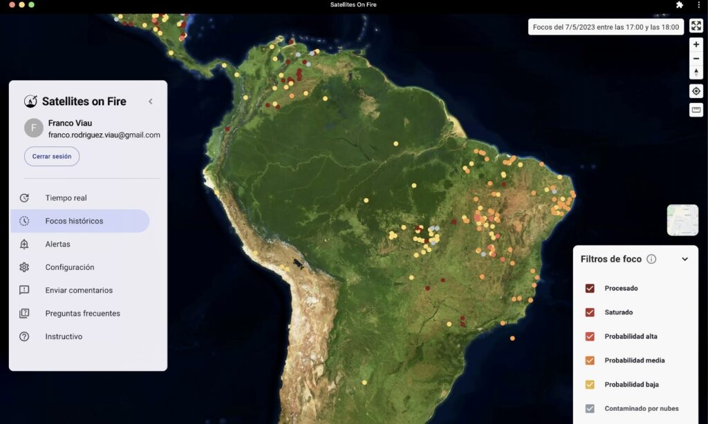La plataforma es abierta y gratuita: cualquiera puede ingresar al sistema para evaluar algún territorio en busca de focos de calor. En vivo y en directo. Hay una parte que es paga -acotó Tomás- para recibir alertas en tiempo real. La plataforma permite enviar alertas a los clientes por WhatsApp, algo que tampoco lleva adelante el sistema de la Nasa, aportando la ubicación exacta del evento.