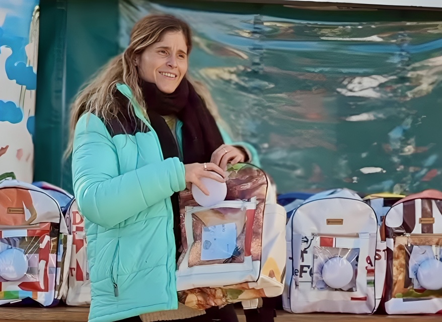 Un buen puñado de empresas cumplen un papel fundamental en el proceso para la creación de las mochilas porque donan los banners que antes eran descartados en vertederos. También llegan a la fábrica las bolsas de un solo uso, las de comida para perro, sachets de leche. Un equipo de marroquineros realiza los diseños y tienen contacto con el territorio para definir dónde se pueden donar las mochilas.