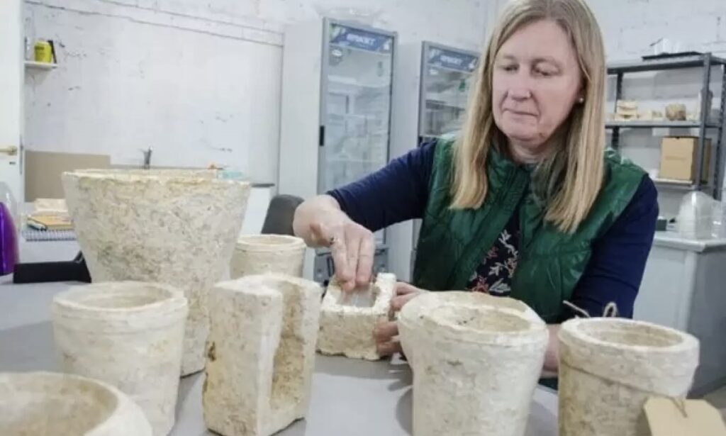 “Elaboramos una especie de masa con parte del hongo y el sustrato. Se incuba durante 25 días y luego se coloca en moldes reutilizables. Tras otros 15 días de incubación, se forman los bloques definitivos”, detalló. Actualmente fabrican macetas compostables y esquineros para embalaje.